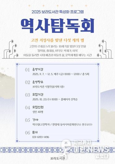이런뉴스(e-runnews) 김삼성 기자 | 용인특례시 보라도서관은 오는 11월 7일부터 12월 5일까지 고전 인문학 프로그램으로 ‘2025 역사 탐독회’를 운영한다고 21일 밝혔다.