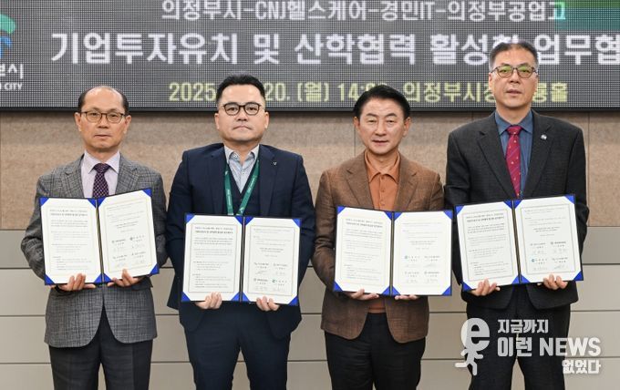 이런뉴스(e-runnews) 김삼성 기자 | 의정부시는 10월 20일 시청 회룡홀에서 ㈜CNJ헬스케어, 경민IT고등학교, 의정부공업고등학교와 함께 ‘기업투자유치 및 산학협력 활성화’를 위한 업무협약을 체결했다.