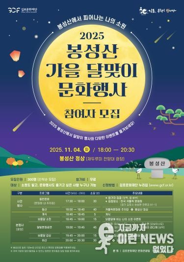 이런뉴스(e-runnews) 김삼성 기자 | 김포문화재단(대표이사 이계현)은 오는 11월 4일 김포 봉성산 일원에서 '2025 봉성산 가을 달맞이 문화행사'를 개최한다고 밝혔다.
