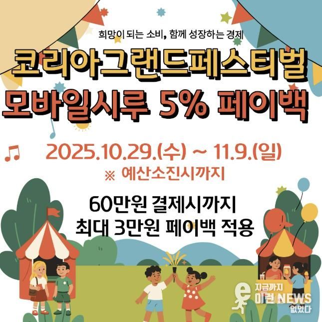 이런뉴스(e-runnews) 김삼성 기자 | 시흥시는 오는 10월 29일부터 11월 9일까지 12일간 정부가 추진하는 ‘코리아 그랜드 페스티벌’에 참여해 시흥화폐 ‘시루’ 모바일결제 시 5%를 돌려주는 환급행사인 페이백을 진행한다. 이를 통해 시민들의 소비를 촉진하고 지역경제에 활력을 불어넣을 계획이다.