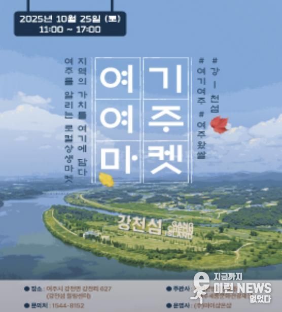 이런뉴스(e-runnews) 김삼성 기자 | 여주세종문화관광재단은 경기콘텐츠진흥원과 함께 10월 25일 강천섬에서 체험형 플리마켓 '2025 여기 여주 마켓'을 개최한다고 밝혔다. 이번 행사는 강천섬을 무대로 지역 로컬기업과 시민이 함께 즐길 수 있는 참여형 플리마켓으로 마련됐으며, 자연 속에서 다양한 체험과 소비가 어우러지는 로컬 축제로 운영된다.