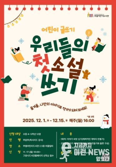 이런뉴스(e-runnews) 김삼성 기자 | 고양특례시 주엽어린이도서관은 오는 12월 1일부터 12월 15일까지 어린이 글쓰기 프로그램 ‘우리들의 첫 소설 쓰기’를 운영한다.