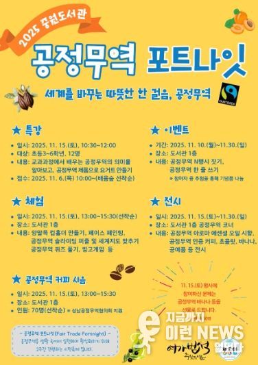 이런뉴스(e-runnews) 김삼성 기자 | 성남도시개발공사 중원도서관은 오는 11월 15일부터 11월 30일까지 ‘2025 공정무역 포트나잇(Fair Trade Fortnight)’ 행사를 운영한다고 13일 밝혔다.