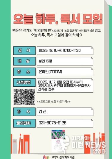 이런뉴스(e-runnews) 김삼성 기자 | 고양특례시 대화도서관은 책을 매개로 다양한 생각과 의견을 나누는 독서 모임 프로그램 ‘오늘 하루, 독서 모임’을 오는 12월 11일에 운영한다.