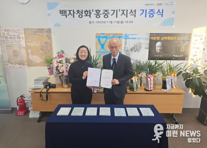 이런뉴스(e-runnews) 김삼성 기자 | 경기문화재단 경기도박물관은 2025년 11월 17일 조선시대 ‘홍중기백자지석’의 기증식을 개최했다. 기증식에는 유물을 기증한 재일교포 이수혜님과 홍중기의 본관인 풍상홍씨 대종회 홍광식 회장, 풍상홍씨 추만공파 종중 홍경희 회장 등이 참석하여 자리를 빛냈다.