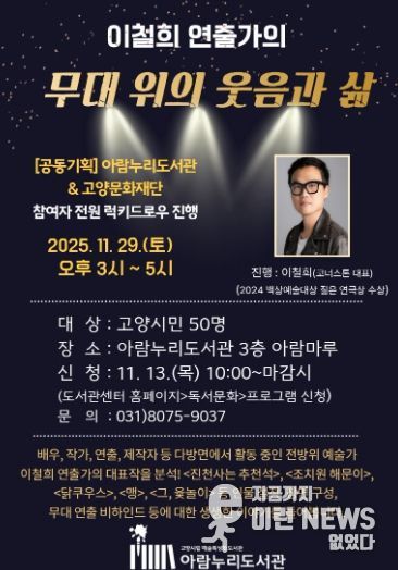 이런뉴스(e-runnews) 김삼성 기자 | 고양특례시 아람누리도서관은 오는 29일 오후 3시, 2024년 제60회 백상예술대상 젊은 연극상 수상자인 이철희 연출가를 초청해 예술특성화 프로그램 ‘무대 위의 웃음과 삶’을 운영한다.
