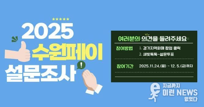 이런뉴스(e-runnews) 김삼성 기자 | 수원특례시가 24일부터 12월 5일까지 ‘2025년 수원페이 사용자 설문조사’를 한다.