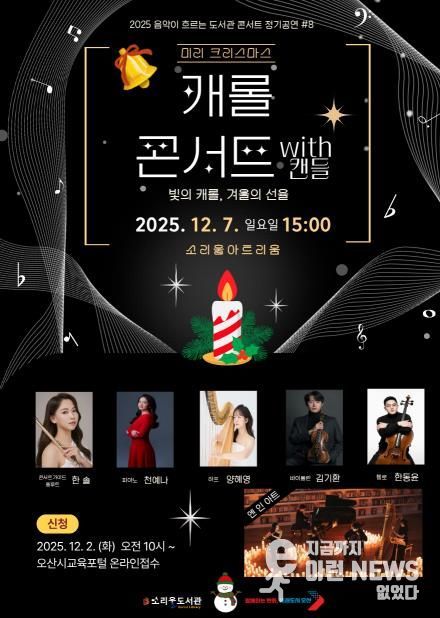 이런뉴스(e-runnews) 김삼성 기자 | 경기도 오산시 소리울도서관은 연말을 맞아 시민들에게 겨울 감성을 선사하는 '미리 크리스마스 – 캐롤 콘서트 with 캔들'을 오는 12월 7일 오후 3시 소리울아트리움에서 개최한다고 밝혔다.