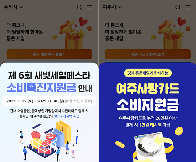 2. 고양시, 남양주시, 수원시, 연천군 등 은 통큰 세일 기간을 훌 넘긴 12월 31일까지 지역화폐 결제 시 5% 캐시백을 제공하며 수원시는 통큰 세일 기간에 맞춰 진행하는 ‘새빛세일페스타 수원’ 이 동시진행 되어 도민들도 수원에서 지역화폐를 쓰면 기존 5% 캐시백에 더해 10% 추가 캐시백 총 15%의 캐시백 혜택을 가져간다.