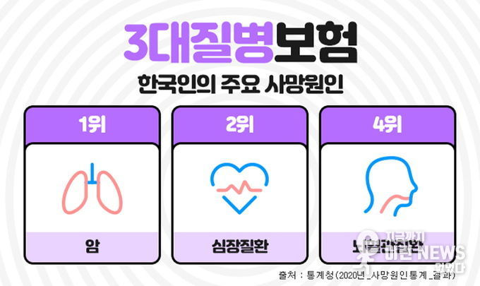 이런뉴스(e-runnews) 김삼성 기자 | 한국인의 주요 사망원인중에 암, 뇌혈관질환, 심혈관질환은 흔히 3대질병이라 일컬어지며 살아가면서 가장 먼저 대비해야 하는 중대질병으로 항상 강조되고 있다. 이들 질병에 미리 대비하기 위해 가입하는 것이 진단비보험인데, 이러한 3대질병진단비를 중점으로 보장하는 보장성보험이 3대진단비보험 이다. 3대질병진단비보험은 각각의 질병에 주목해서 보장하기도 하지만, 나에게 맞는 추가 특약을 잘 골라서 가입한다면 종합건강보험으로도 충분히 활용도가 높다.