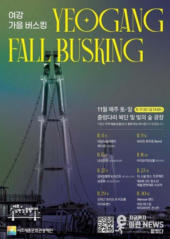 이런뉴스(e-runnews) 김삼성 기자 | 여주세종문화관광재단은 9월부터 11월까지 가을 시즌을 맞아 여주 남한강 출렁다리 일원에서 운영한 '여강 폴 나잇 버스킹'이 시민과 관광객들의 큰 호응 속에 성황리에 마무리됐다고 밝혔다.