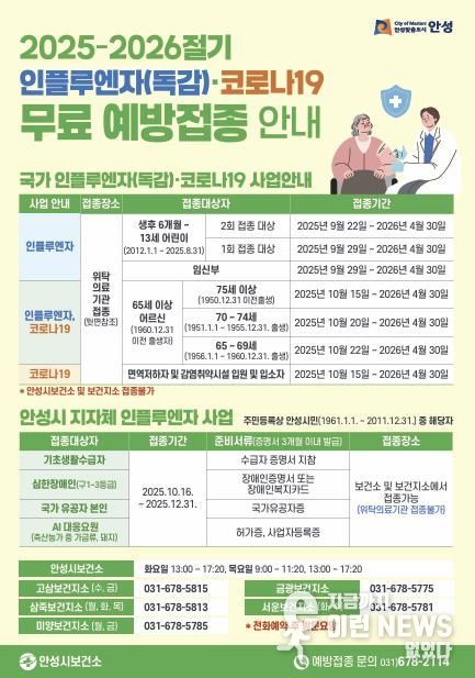 이런뉴스(e-runnews) 김삼성 기자 | 안성시는 최근 인플루엔자(독감) 의사환자가 급증하면서 어린이, 임신부, 65세 이상 어르신 등은 인플루엔자 백신접종을 서둘러 줄 것을 당부했다.
