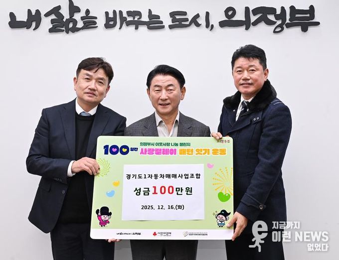 이런뉴스(e-runnews) 김삼성 기자 | 의정부시는 12월 16일 경기도1자동차매매사업조합 의정부지부가 지역사회 나눔 문화 확산을 위한 ‘100일간 사랑릴레이 배턴 잇기’에 동참해 성금 100만 원을 기부했다고 밝혔다.