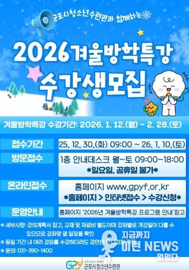 이런뉴스(e-runnews) 김삼성 기자 | (재)군포시청소년재단 군포시청소년수련관은 2026년 1월 12일부터 2월 28일까지 겨울방학을 맞아 문화·체육 분야 겨울방학특강 프로그램을 운영한다.