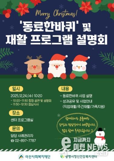 센터는 오는 24일 센터 프로그램실(광명시 오리로 1018, 5층)에서 아산사회복지재단 공모사업 ‘동료 한 바퀴’와 2025년 재활프로그램 평가회 및 2026년 프로그램 설명회를 개최한다.
