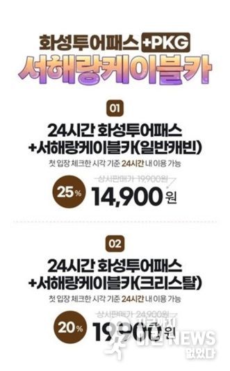 ‘화성투어패스 + 서해랑케이블카 PKG권’은 화성투어패스 이용권을 구매하면 서해랑케이블카 크리스탈 캐빈이나 일반 캐빈을 무료로 이용할 수 있는 상품으로, 이벤트 기간 동안은 기존 가격 대비 5천 원 할인해 판매한다.