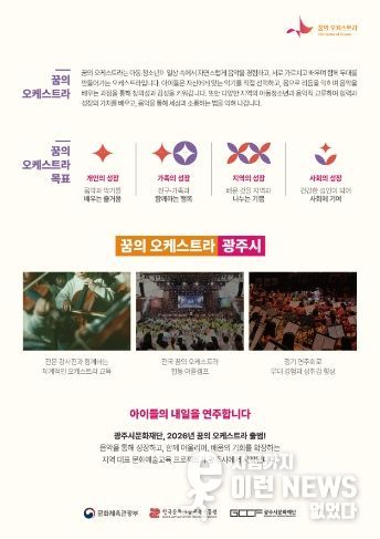 이런뉴스(e-runnews) 김삼성 기자 | (재)광주시문화재단은 문화체육관광부가 주최하고 한국문화예술교육진흥원이 주관하는 ‘2026 꿈의 오케스트라 운영사업’에서 예비 거점기관 단계를 거쳐 최종 신규 거점기관으로 선정됐다고 22일 밝혔다.