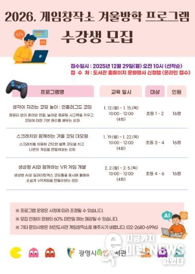 이런뉴스(e-runnews) 김삼성 기자 | 광명시 게임창작소는 오는 29일 오전 10시부터 겨울방학 프로그램 수강생을 모집한다.