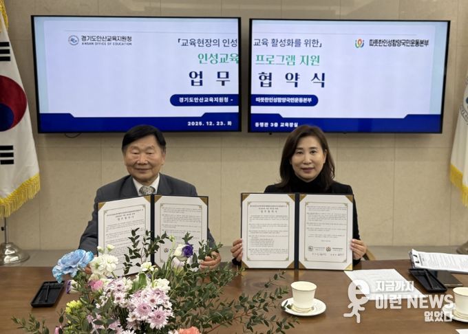 이런뉴스(e-runnews) 김삼성 기자 | 경기도안산교육지원청은 12월 23일 오후 3시 30분, 따뜻한인성함양국민운동본부와 학교 현장의 인성교육 강화와 도덕성 회복을 위한 지역 연계형 인성교육 지원 체계 구축을 위한 업무협약(MOU)을 체결했다.
