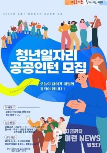 이런뉴스(e-runnews) 김삼성 기자 | 이천시는 2026년 1월 5일부터 1월 16일까지 ‘청년일자리 공공인턴사업’의 상반기 참여자 47명을 모집한다.