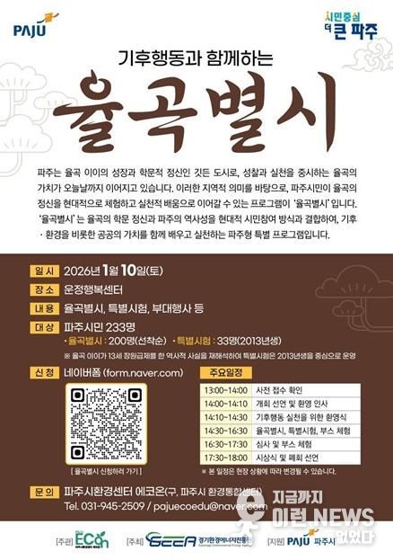 파주시환경센터 에코온 관계자는 “율곡별시는 단지 시험을 치르는 행사가 아니라, 가족과 아이들이 함께 참여하며 기후행동을 자연스럽게 경험하는 문화축제”라며 “미래세대인 청소년이 주체가 되어 기후 위기 대응의 가치를 배우고 실천으로 이어갈 수 있는 계기가 되길 바란다”라고 밝혔다.