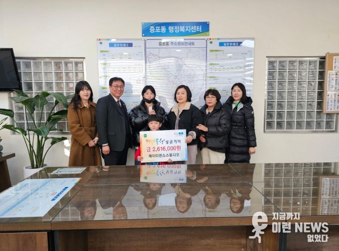 이번 기탁금은 제이티댄스스튜디오 회원들의 기부품을 모아 개최한 바자회를 통해 마련한 수익금으로, 지역 내 어려운 아이들을 돕고자 전달됐다. 올해로 6년째 증포동에 성금을 기탁하고 있는 제이티댄스스튜디오는 소외계층을 위해 꾸준한 나눔을 실천하고 있다.