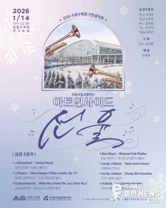 이런뉴스(e-runnews) 김삼성 기자 | 수원특례시는 1월 14일 일월수목원 전시온실에서 수원시립교향악단 아트인사이드 ‘선율’을 개최한다.