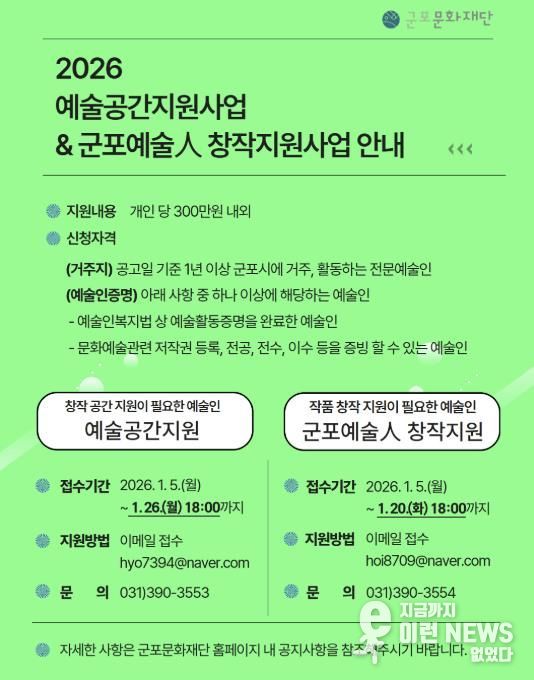 이런뉴스(e-runnews) 김삼성 기자 | 군포문화재단은 군포시에서 활동하는 전문예술인을 대상으로 예술인 지원사업 공모를 시작한다고 밝혔다. 예술인의 안정적인 창작환경 조성과 창작활동 활성화를 위한 ▲예술공간지원사업과 신규 창작 작품 및 프로그램 제작을 지원하는 ▲군포예술人 창작지원사업이 두 개의 개별 사업으로 운영된다.