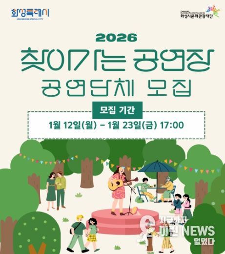 이런뉴스(e-runnews) 김삼성 기자 | (재)화성시문화관광재단은 1월 12일부터 1월 23일까지 ‘2026 찾아가는공연장’ 참여 공연단체를 모집한다고 밝혔다.