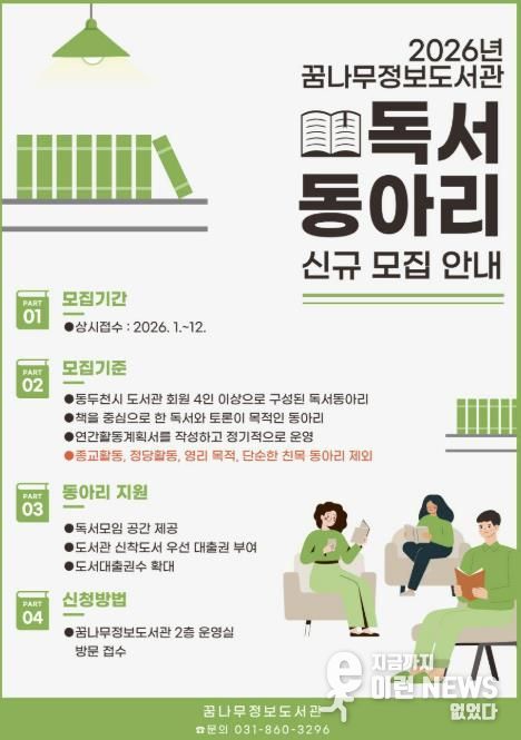 이런뉴스(e-runnews) 김삼성 기자 | 동두천시 도서문화사업소 꿈나무정보도서관은 시민들의 인문적 사고력 향상과 토론 문화 활성화를 위해 2026년 신규 독서동아리를 모집한다고 밝혔다.