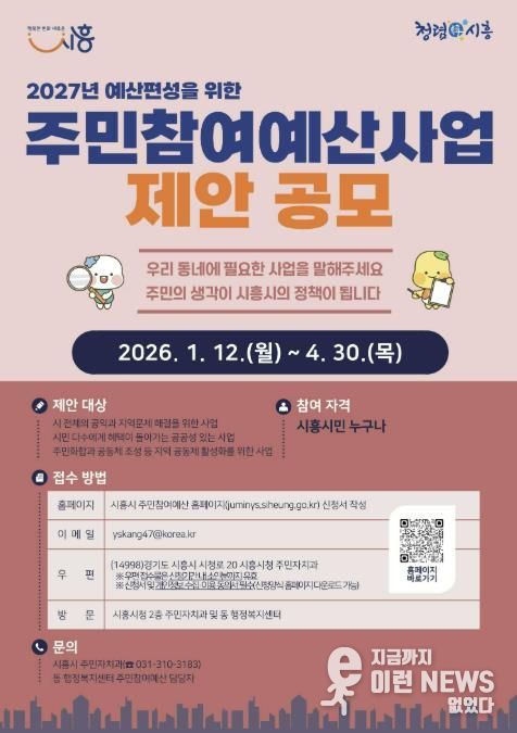 이런뉴스(e-runnews) 김삼성 기자 | 시흥시는 오는 4월 30일까지 주민들이 직접 사업을 제안하는 ‘시흥시 주민참여예산 제안’을 신청받는다.