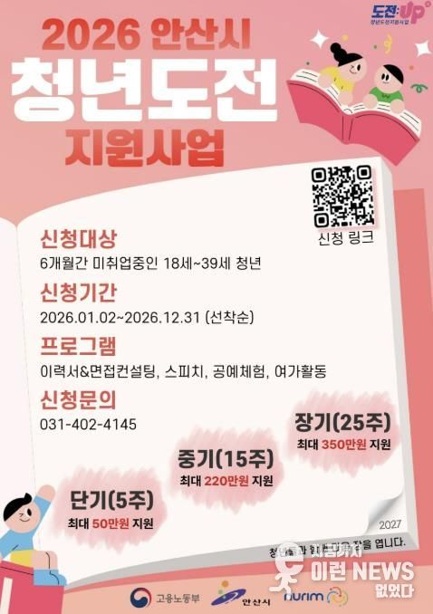이런뉴스(e-runnews) 김삼성 기자 | 안산시가 구직 청년들의 사회 진입과 취업을 지원하기 위해 청년도전 지원 사업 참여자를 모집한다고 15일 밝혔다.