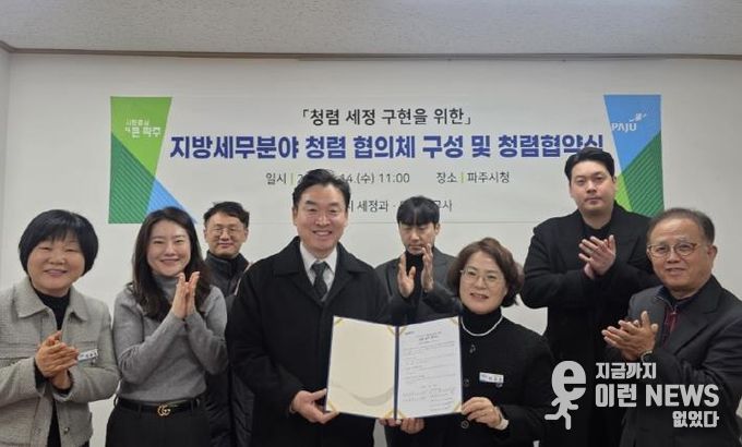 이런뉴스(e-runnews) 김삼성 기자 | 파주시는 지난 14일 파주지역세무사회(마을세무사)와 함께 청렴 문화의 정착과 확산을 위한 민관 청렴협의체를 구성하고, 청렴 실천을 위한 협약을 체결했다고 밝혔다.