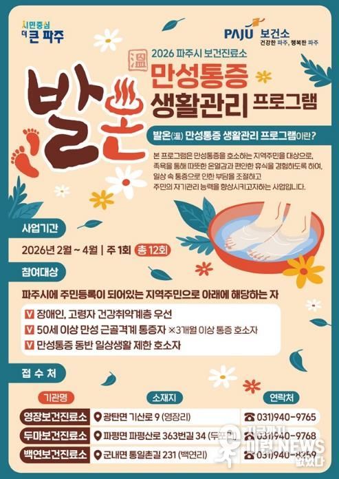 이런뉴스(e-runnews) 김삼성 기자 | 파주시 보건진료소는 보건의료 취약지역 주민들의 건강증진을 위해 2026년 ‘발온(溫) 만성통증 생활관리’교실을 운영한다.
