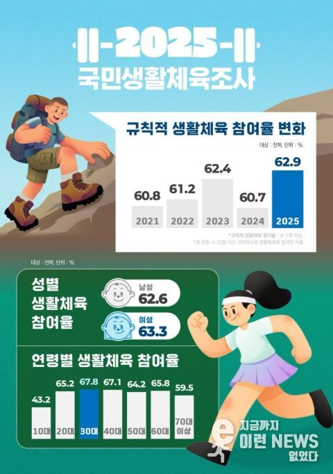 이런뉴스(e-runnews) 김삼성 기자 | 문화체육관광부는 만 10세 이상인 국민 9천 명을 대상으로 시행한 ‘2025년 국민생활체육조사’ 결과를 발표했다.