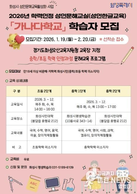 이런뉴스(e-runnews) 김삼성 기자 | 화성특례시는 19일부터 2월 20일까지 2026년 성인을 위한 한글교실 ‘가나다학교’ 및 ‘늘배움학교’ 수강생을 선착순 모집한다고 19일 밝혔다.