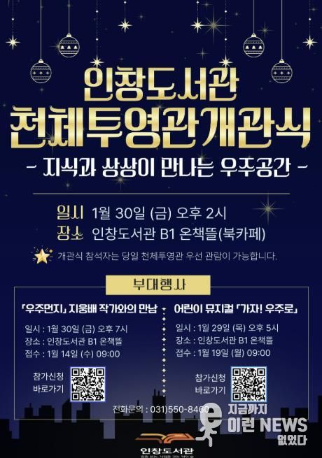 또한 1월 29일 오후 5시에는 우주인이 되기 위한 훈련 과정을 그린 우주과학 뮤지컬 ‘가자! 우주로’가 운영돼, 어린이들에게 우주에 대한 호기심과 상상력을 키워줄 것으로 기대된다. 행사와 관련한 자세한 사항은 인창도서관 홈페이지를 참고하거나 도서관정책팀으로 문의하면 된다.