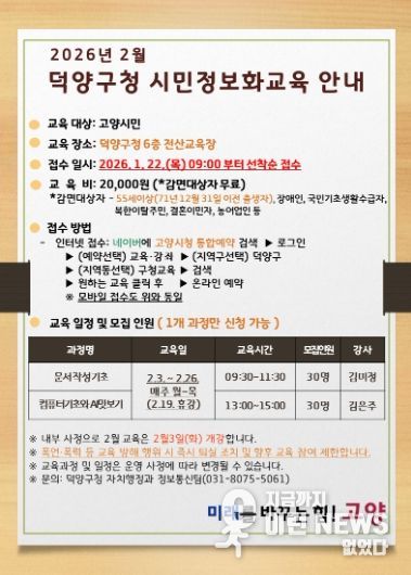 이런뉴스(e-runnews) 김삼성 기자 | 고양특례시 덕양구는 고양시민의 디지털 역량 강화를 위해 ‘2026년 제1차 덕양구 시민정보화교육’ 수강생을 오는 22일부터 모집한다고 밝혔다.