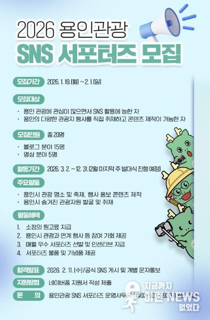 이런뉴스(e-runnews) 김삼성 기자 | 용인특례시는 2월 1일까지 용인의 관광자원과 다채로운 축제·행사를 시민의 시각에서 생동감 있게 홍보할 ‘용인관광 SNS 서포터즈’를 모집한다고 20일 밝혔다.