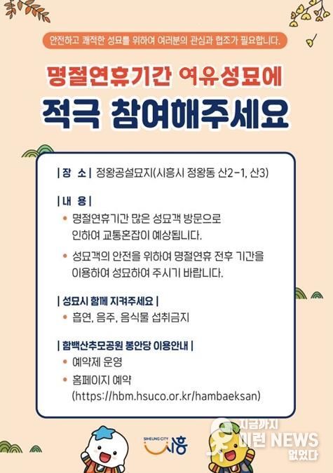 이런뉴스(e-runnews) 김삼성 기자 | 시흥시는 우리 민족 고유의 명절인 설을 맞아 성묘객 밀집에 따른 안전사고를 예방하고 시민 편의 증진을 위해 명절 연휴 전후 여유 성묘 캠페인을 추진하고 있다.