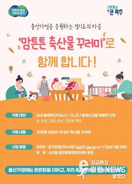 ‘맘튼튼 축산물 꾸러미’지원 사업은 2026년 파주시에서 출생신고를 마친 산모를 대상으로 10만 원 상당의 축산물 꾸러미를 제공하는 사업으로, 출산 후 산모의 영양 보충을 돕고 지역 축산물 소비를 활성화해 축산 농가의 경영 안정을 도모하기 위해 마련됐다.