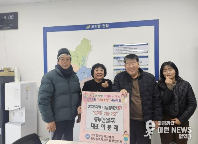 이런뉴스(e-runnews) 김삼성 기자 | 동부건설(주)은 지역사회 이웃사랑 실천을 위해 지난 26일 오학동행정복지센터에 현금 100만 원을 기탁했다.