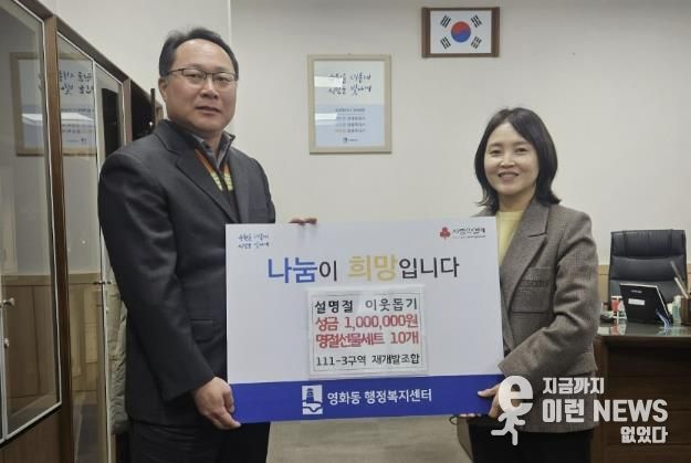 이런뉴스(e-runnews) 김삼성 기자 | 수원시 장안구 영화동 111-3구역 주택재개발정비사업조합이 지난 28일, 설 명절을 맞아 영화동 행정복지센터에 130만원 상당의 후원금품을 전달했다.