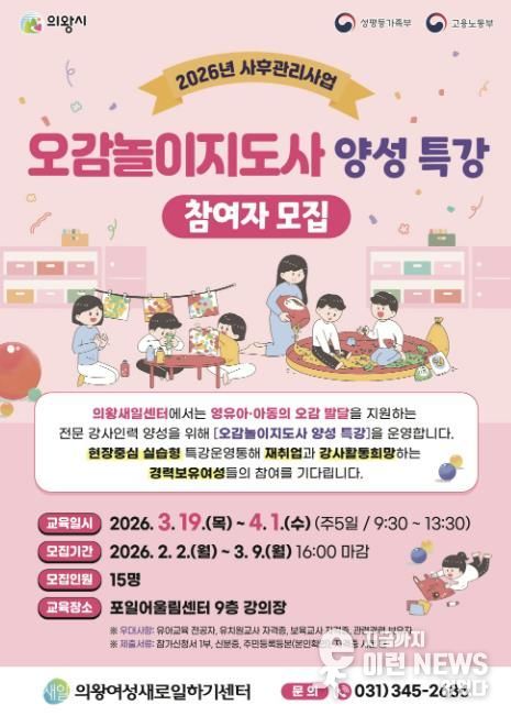 이런뉴스(e-runnews) 김삼성 기자 | 의왕시 여성새로일하기센터가 '오감놀이지도사 양성 특강'의 교육생을 모집한다.