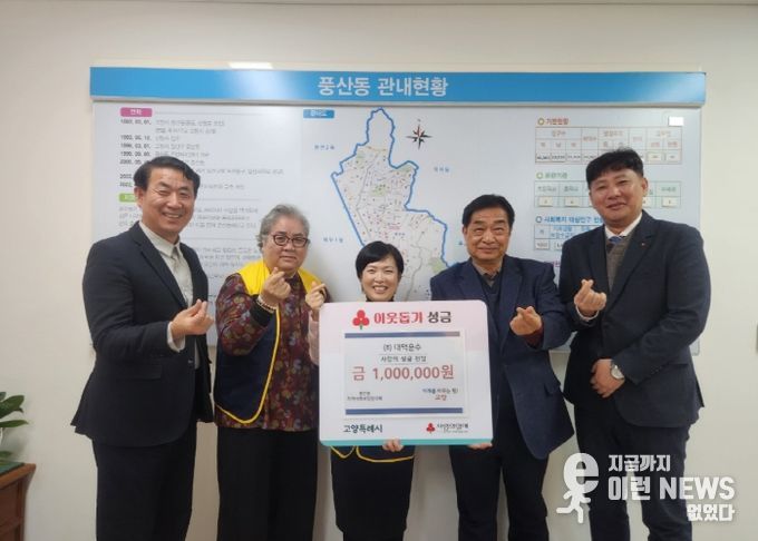이런뉴스(e-runnews) 김삼성 기자 | 고양특례시 일산동구 풍산동은 지난 28일 ㈜대덕운수가 취약계층 지원을 위한 성금 100만 원을 기부했다고 밝혔다.