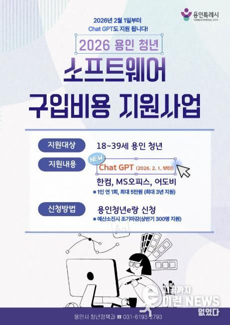 이런뉴스(e-runnews) 김삼성 기자 | 용인특례시는 청년들의 디지털 역량 강화를 위해 ‘청년 소프트웨어 구입비용 지원사업’ 대상 품목에 ‘ChatGPT Plus’를 추가했다고 2일 밝혔다.