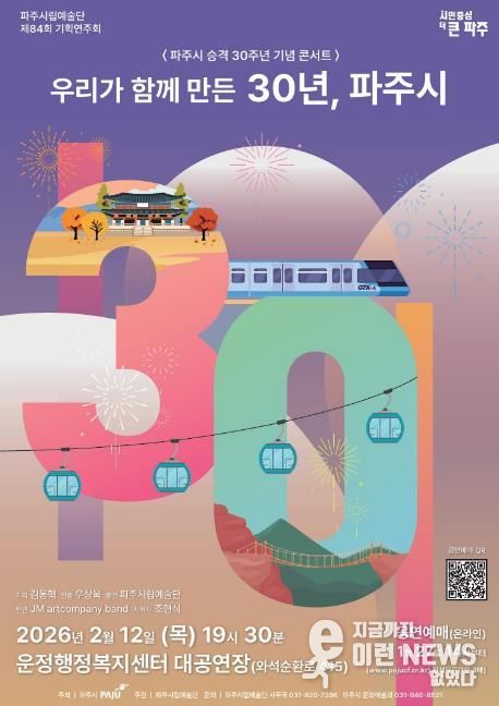 유초자 문화예술과장은 “시민과 함께 걸어온 30년의 시간을 예술로 기억하며, 이번 무대가 파주의 새로운 미래를 힘차게 열어가는 벅찬 출발점이 되기를 바란다”라고 밝혔다.