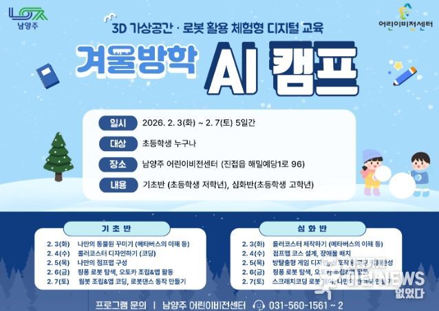 이번 겨울방학 AI 캠프의 참가비는 1인당 7만 원이다. 기초반은 오전 10시부터 11시 50분까지 정원 15명으로 운영하고, 심화반은 오후 2시부터 3시 50분까지 정원 20명으로 운영한다. 자세한 사항은 남양주시 어린이비전센터로 문의하거나 누리집에서 확인할 수 있다.