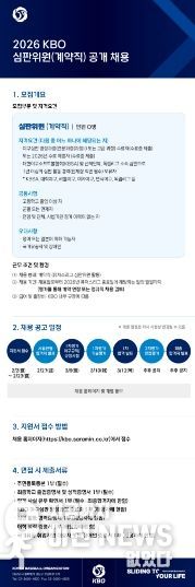 이번 채용은 KBO 야구심판 양성과정 수료자(2026년 야구심판 양성과정 수료 예정자 포함) 또는 대한야구소프트볼협회(KBSA) 및 산하단체, 독립리그 소속 심판으로 1년 이상의 심판 활동 경력(단체장 직인 필수) 보유자에 한해서 지원이 가능하다. 최종 합격자는 2026 KBO 공식 심판위원으로 활동하게 되며, 근무 종료 후 평가 결과에 따라 정규직 전환이 검토된다.