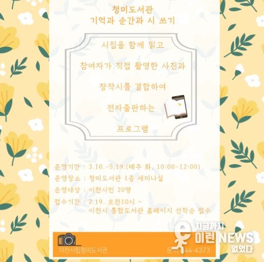 이런뉴스(e-runnews) 김삼성 기자 | 이천시 청미도서관은 시민들이 직접 찍은 사진으로 시를 쓰고 전자책을 출판하는 ‘기억과 순간과 시 쓰기’ 프로그램을 운영한다.